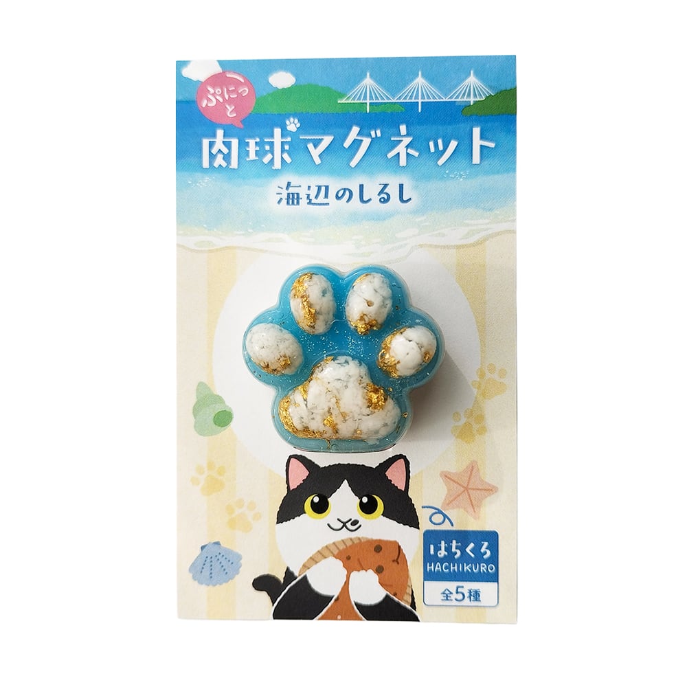 瀬戸内海の風が通り抜ける尾道の浜辺と、そこに暮らす猫たちをモチーフにしたぷっくり肉球型のマグネットです。